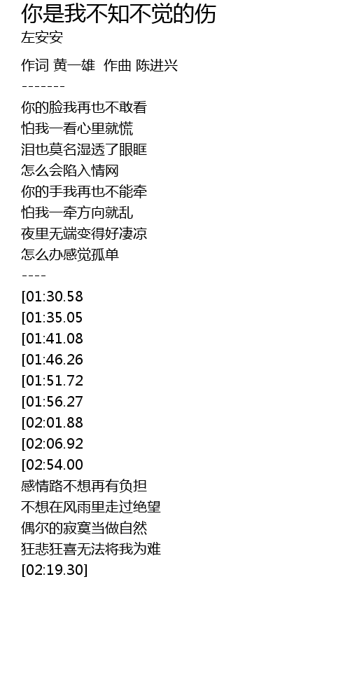 | [03:18.58][01:51.72] | 你是我不知不觉的伤 |