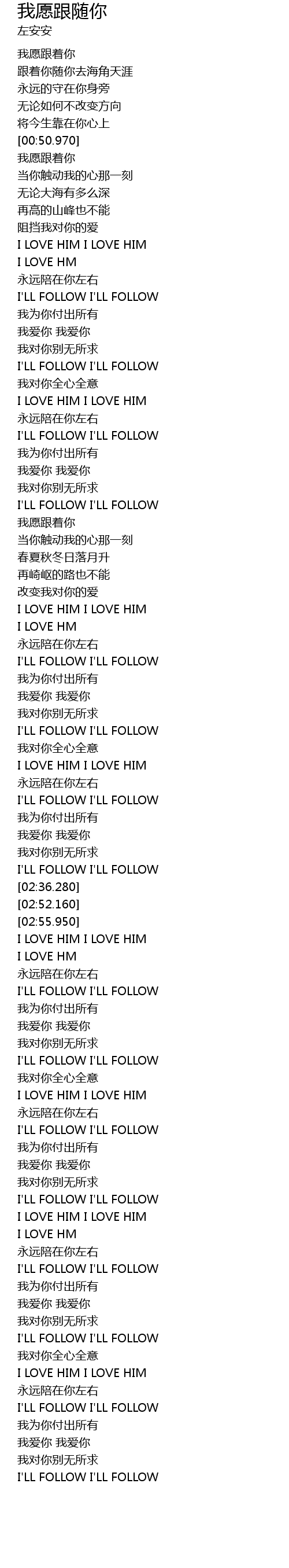 | [01:44.490] | wǒ yuàn gēn zhe nǐ |