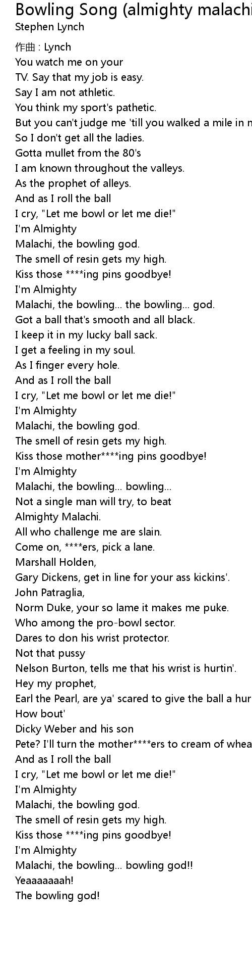 | Song | Bowling Song (almighty malachi, professional bowling god) |