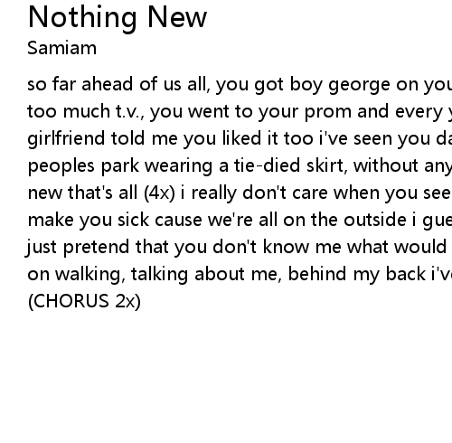 so far ahead of us all, you got boy george on your wall just admit it, you watch too much t.v., you went to your prom and every year you went to summer camp my girlfriend told me you liked it too i've seen you dancing with the hippies in peoples park wearing a tie-died skirt, without any shoes (CHORUS) you're nothing new that's all (4x) i really don't care when you see me on the street i know i make you sick cause we're all on the outside i guess that means you're in so just pretend that you don't know me what would your real friends say just keep on walking, talking about me, behind my back i've only got one thing to say (CHORUS 2x)