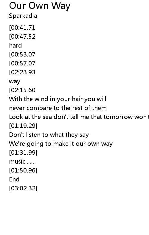 | [02:29.76][02:23.93][02:18.31][02:12.35][01:01.60] | We're going to make it our own way |