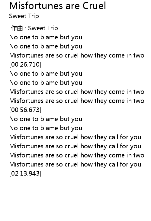 | [00:48.601] | Misfortunes are so cruel how they come in two |