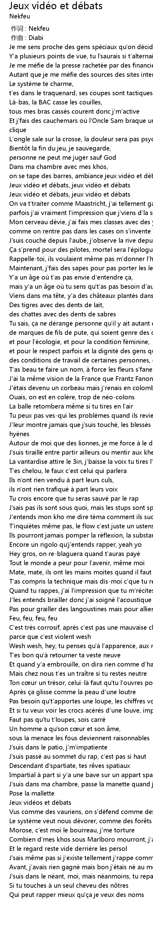 | [00:41.84] | Jeux vidé o et dé bats, jeux vidé o et dé bats |