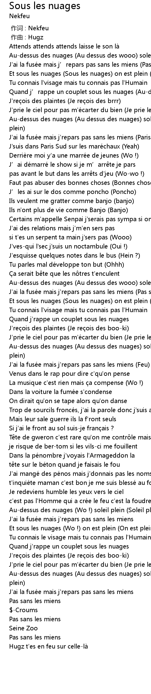 | [00:13.03] | Et sous les nuages (Sous les nuages) on est plein (On est plein) |