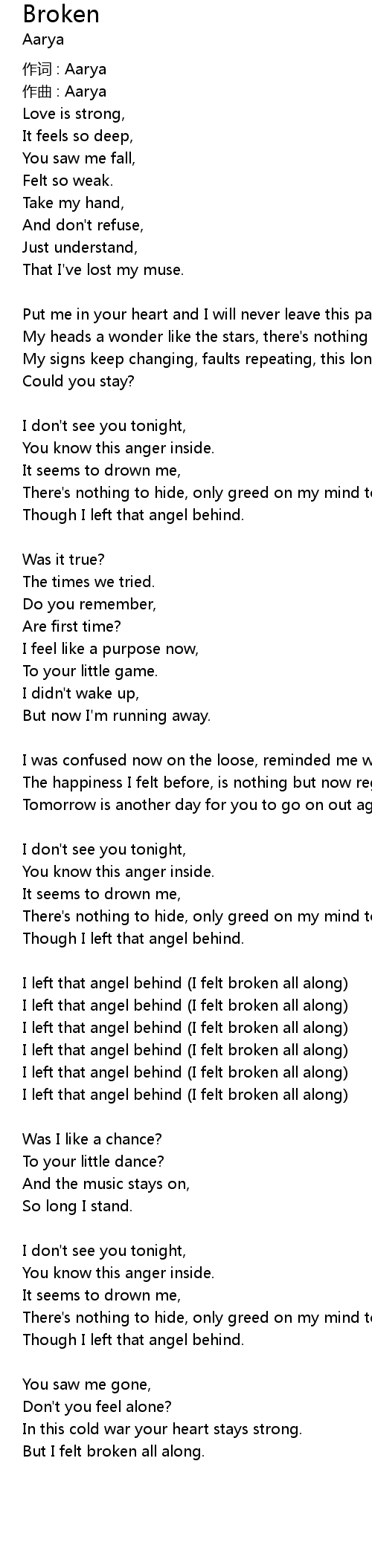 | I left that angel behind I felt broken all along | |