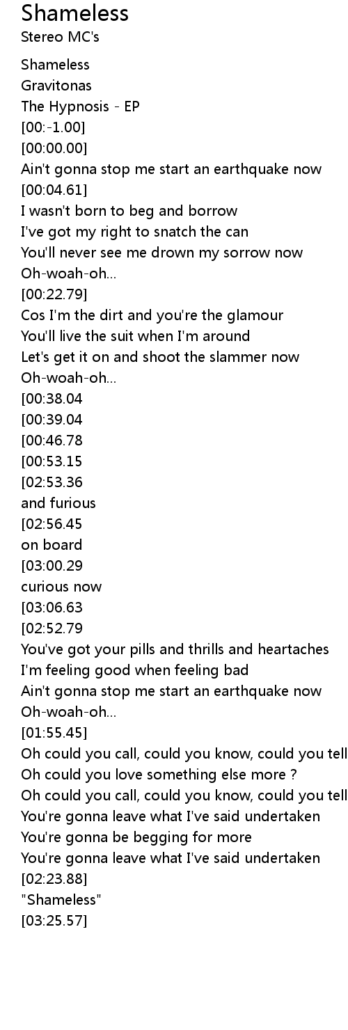 [03:11.98][02:56.45][02:40.94][02:30.30][01:43.78][00:57.54] I'm shameless, get on board