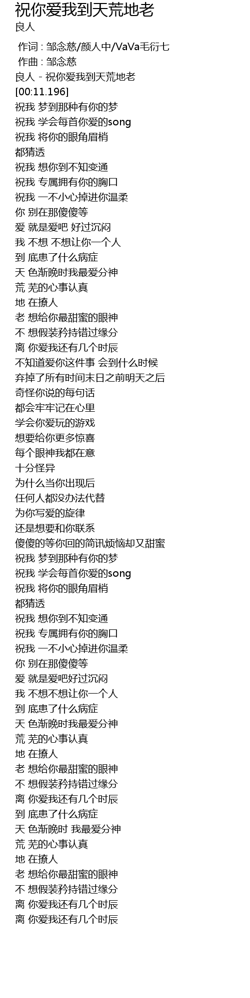 | [00:10.204] | liáng rén zhù nǐ ài wǒ dào tiān huāng dì lǎo |