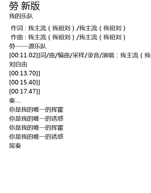 | [00:11.02]] | 词/曲/编曲/采样/录音/演唱:我主流(我祖刘)& 刘自由 |