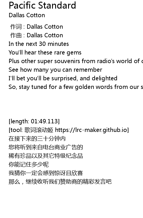 | [00:00.000] | zuo ci : Dallas Cotton |