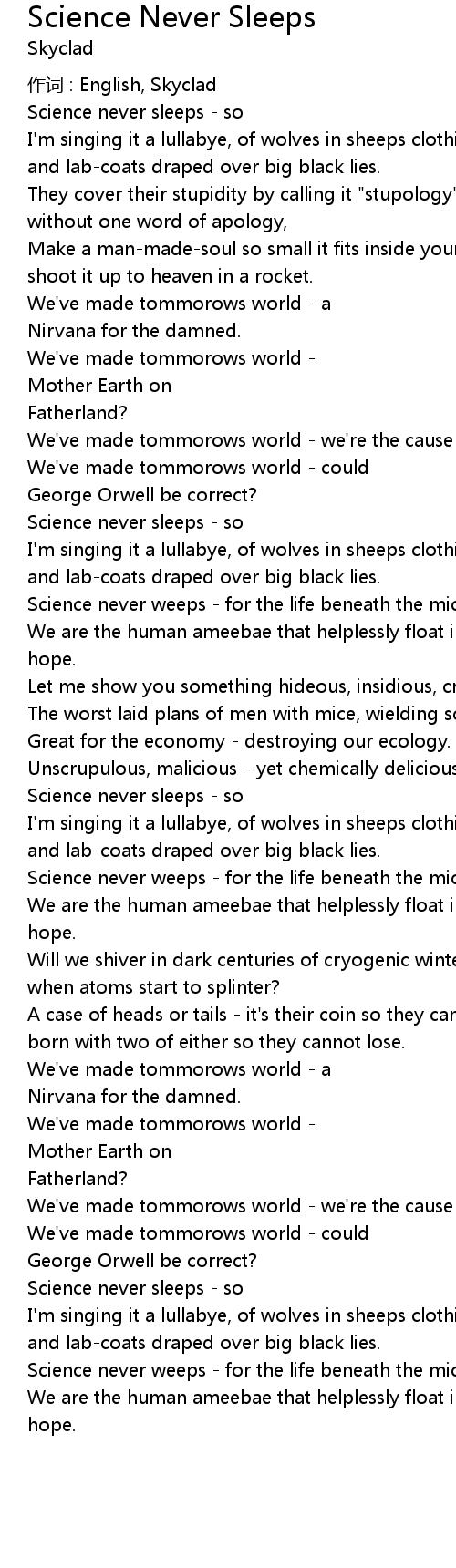 | I'm singing it a lullabye, of wolves in sheeps clothing - devils in disguise, and lab-coats draped over big black lies. | |