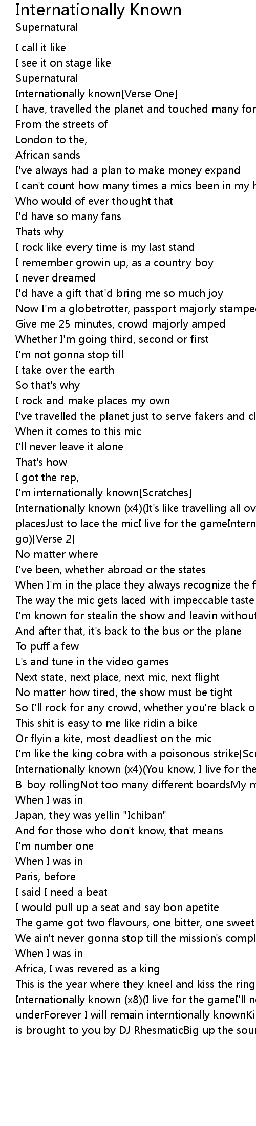 Internationally known (x8)(I live for the gameI'll never let the game take me underForever I will remain interntionally knownKilling all clones and fakersThis is brought to you by DJ RhesmaticBig up the soundSupernat, 2 dot dot two) |