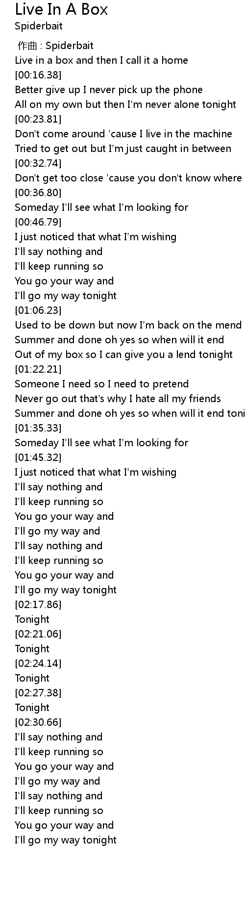 | [01:18.63] | Out of my box so I can give you a lend tonight |