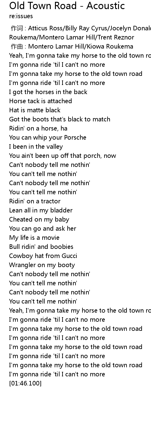 | [01:17.007] | Yeah, I'm gonna take my horse to the old town road |