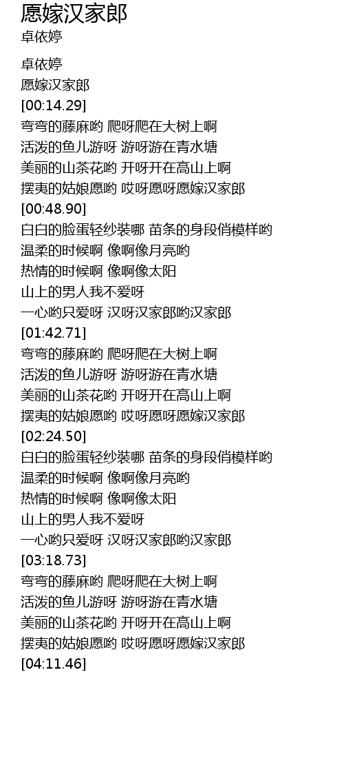 | [00:40.81] | bǎi yí de gū niáng yuàn yō āi yā yuàn ya yuàn jià hàn jiā láng |
