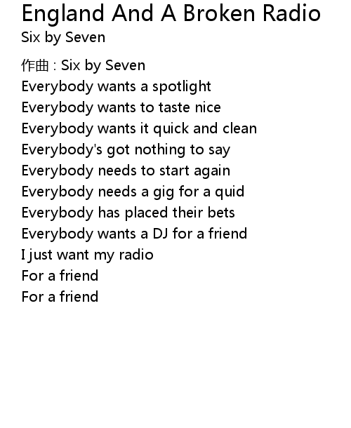 | Song | England And A Broken Radio |