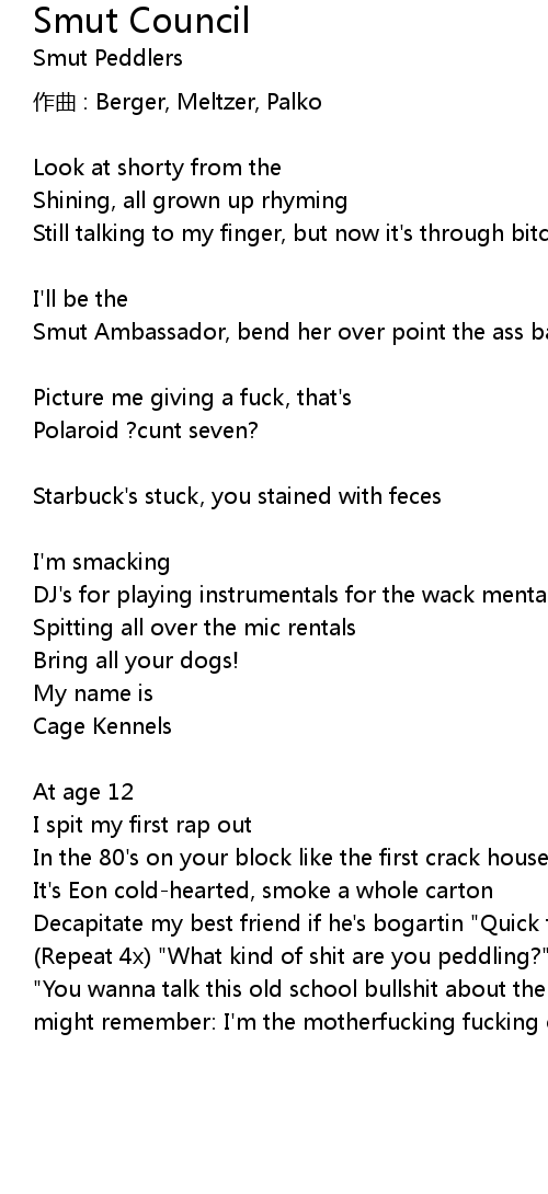 | Decapitate my best friend if he' s bogartin " Quick to be like" " Peddling smut!" Repeat 4x " What kind of shit are you peddling?" " Ppporn" " Smut peddlers" " You wanna talk this old school bullshit about the rules? Well here' s a rule you might remember: I' m the motherfucking fucking one who calls the shots |
