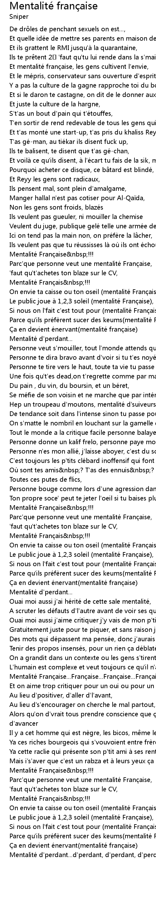 | Mentalité Fran aise... Fran aise... Fran aise... Fran aise, | |