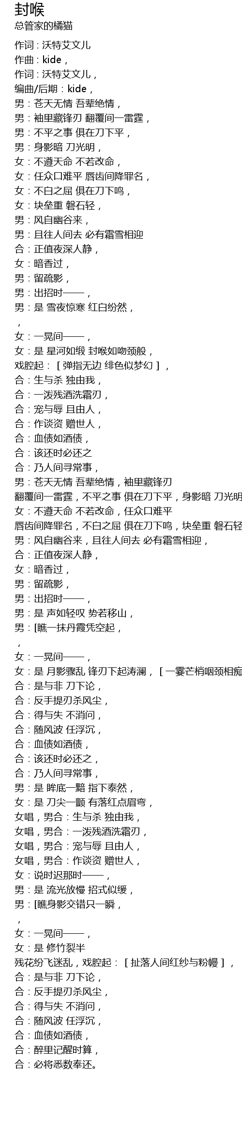 | 男:苍天无情 吾辈绝情,袖里藏锋刃 翻覆间一雷霆,不平之事 俱在刀下平,身影暗 刀光明, | |