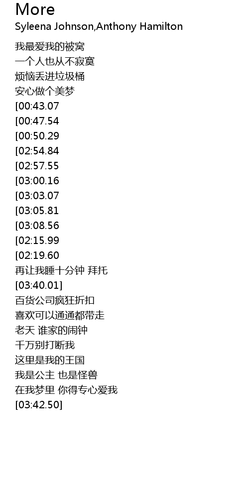 | [03:30.78][03:05.81][02:10.36][01:06.57] | 再给我more more more |