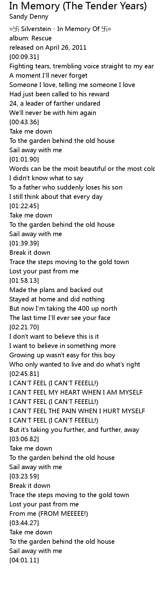 | [00:00.00] | ≡卐 Silverstein - In Memory Of 卐≡ |