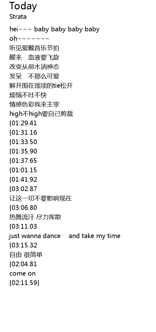 | [03:27.97][03:11.03][02:53.72][01:54.55][01:18.46] | ming tian sun will shine Cause I just wanna dance and take my time |