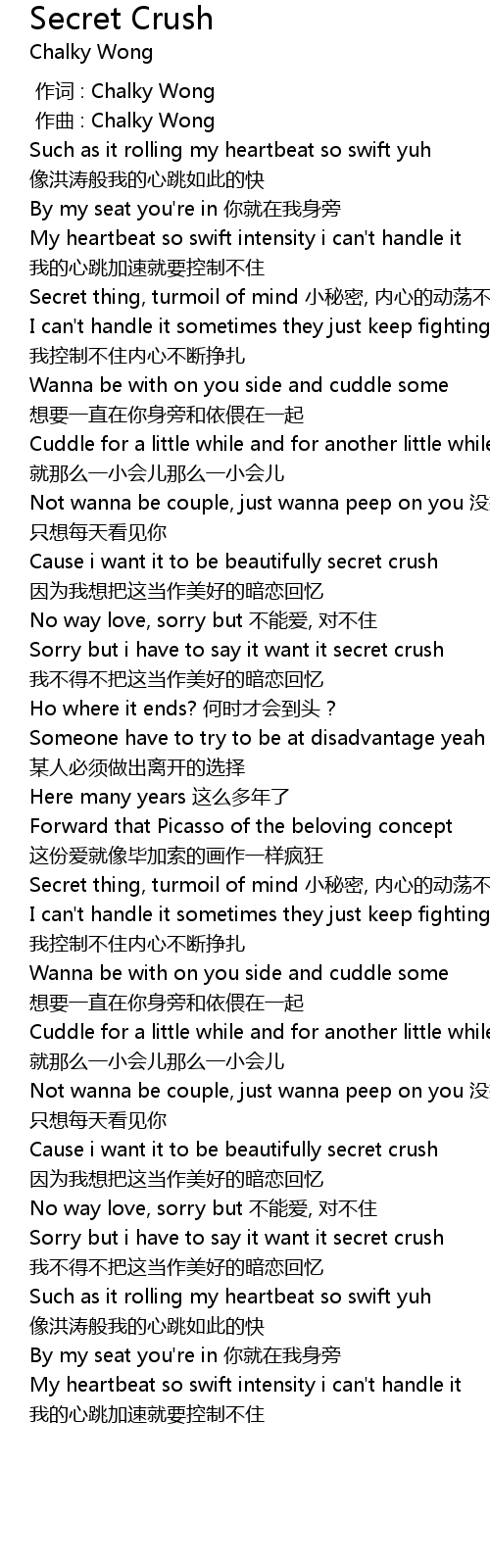 | [00:29.240] | Cause i want it to be beautifully secret crush yīn wèi wǒ xiǎng bǎ zhè dàng zuò měi hǎo de àn liàn huí yì |