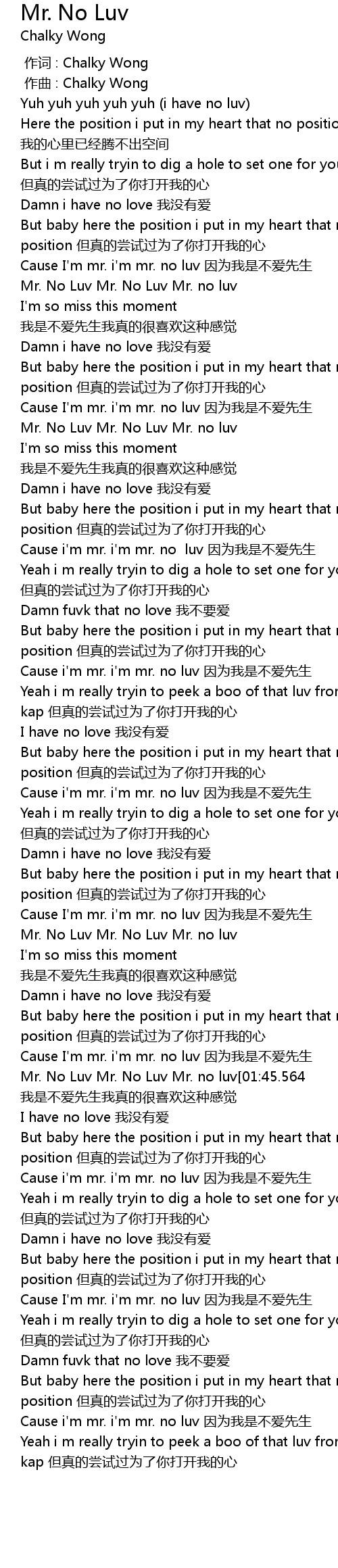 | [01:28.735] | Mr. No Luv Mr. No Luv Mr. no luv |