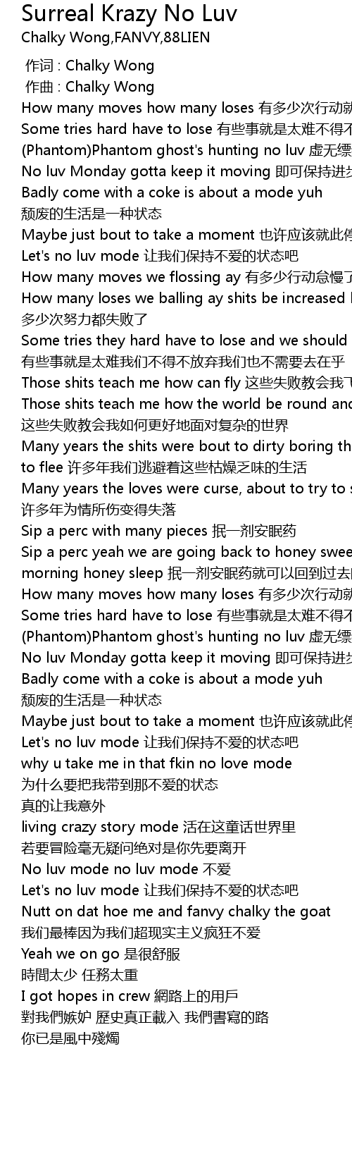 | [01:33.476] | No luv mode no luv mode 不爱 |