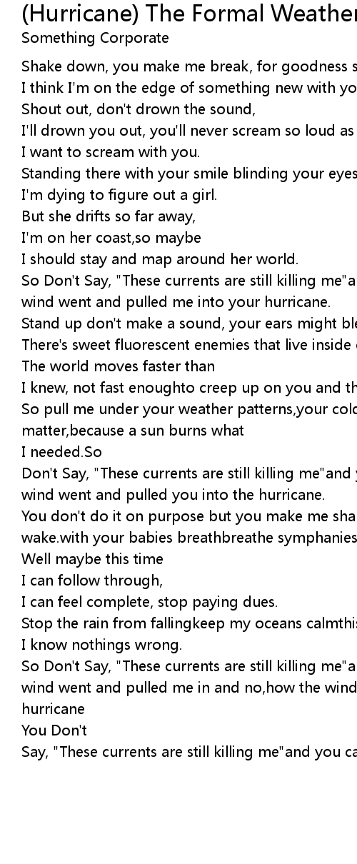 So Don't Say, "These currents are still killing me"and you can't explainhow the wind went and pulled me in and no,how the wind went and pulled me into your hurricane |