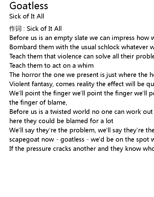 | We' ll say they' re the problem, we' ll say they' re the cause they' ll be the scapegoat now goatless we' d be on the spot we can' t let the truth come out | |