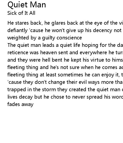 The quiet man leads a quiet life hoping for the day he sees the light his reticence was heaven sent and everywhere he turned he saw the ways of the world and they were hell bent he kept his virtue to himself peace of mind is a fleeting thing and he's not sure when he comes across it peace of mind is a fleeting thing at least sometimes he can enjoy it, that's more than they can say 'cause they don't change their evil ways more than they can say 'cause they're trapped in the storm they created the quiet man could say he's seen so many lives decay but he chose to never spread his word so when he's gone his virtue fades away |