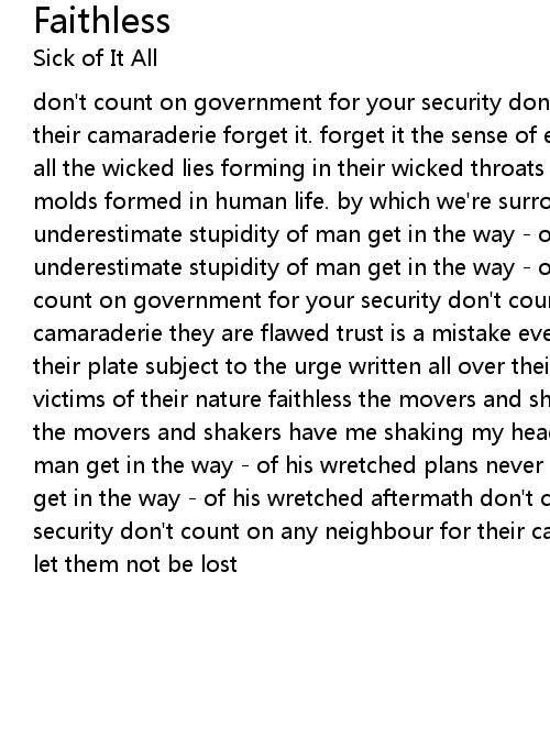 don't count on government for your security don't count on any neighbour for their camaraderie forget it. forget it the sense of ease you would wish for most all the wicked lies forming in their wicked throats oh. to break all the wicked molds formed in human life. by which we're surrounded faithless never underestimate stupidity of man get in the way - of his wretched plans never underestimate stupidity of man get in the way - of his wretched aftermath don't count on government for your security don't count on any neighbour for their camaraderie they are flawed trust is a mistake even decent men mess what's on their plate subject to the urge written all over their face fallen decent men. victims of their nature faithless the movers and shakers have me moving far away the movers and shakers have me shaking my head never underestimate stupidity of man get in the way - of his wretched plans never underestimate stupidity of man get in the way - of his wretched aftermath don't count on government for your security don't count on any neighbour for their camaraderie comfort. friendship let them not be lost |
