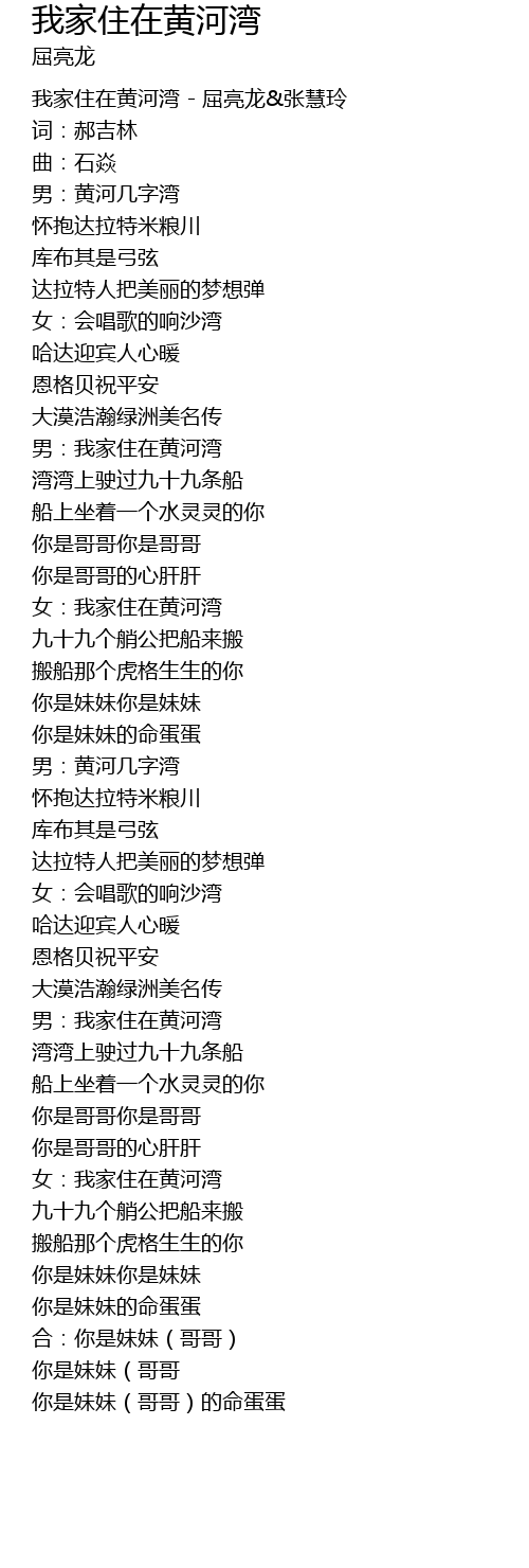 | [01:24.96] | nǚ: wǒ jiā zhù zài huáng hé wān |