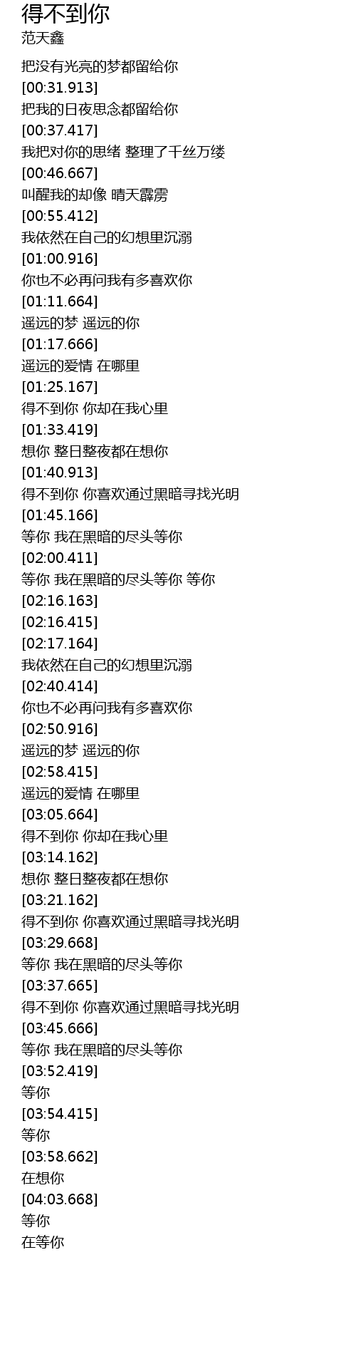 | [03:38.166] | 得不到你 你喜欢通过黑暗寻找光明 |