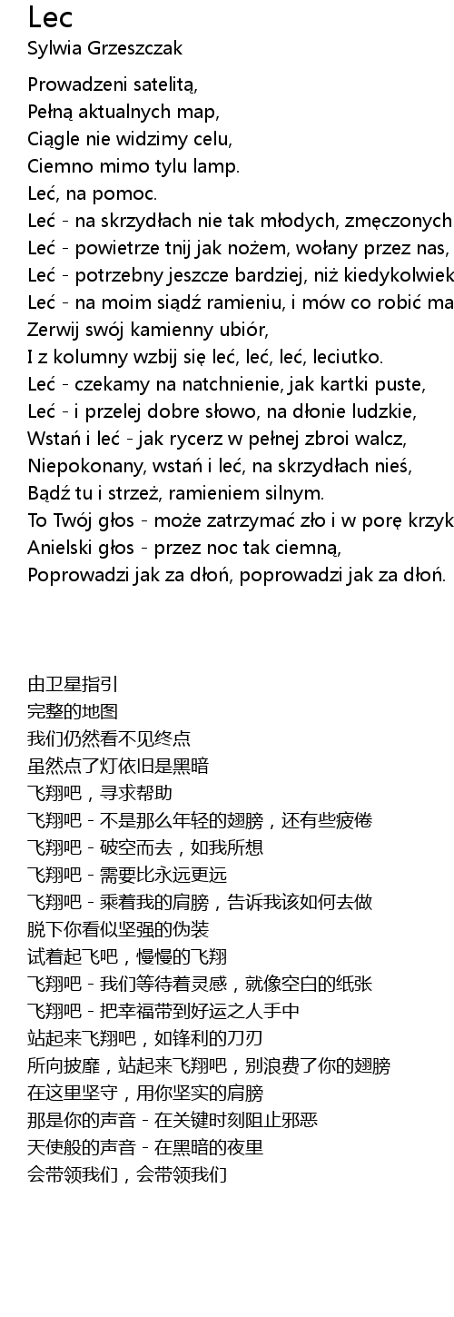 | [00:46.15] | Leć - na skrzydłach nie tak młodych, zmęczonych z lekka, |