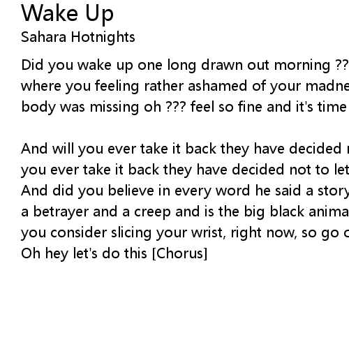 Did you wake up one long drawn out morning ??? blessed with the naked (head?) where you feeling rather ashamed of your madness when you found out that one body was missing oh ??? feel so fine and it's time to clean up this mess, right now [Chorus:] |