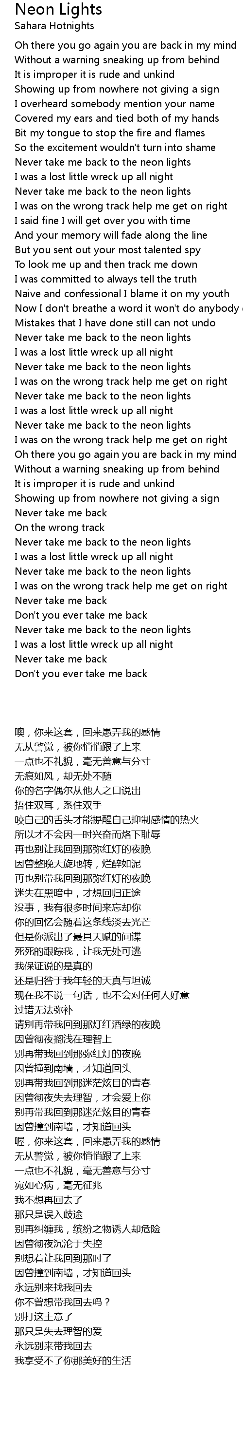 Never take me back to the neon lights |