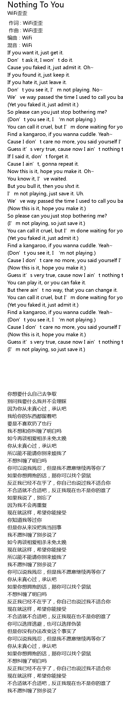 | [02:19.600] | Guess it' s very true, cause now I ain' t nothing to you. |