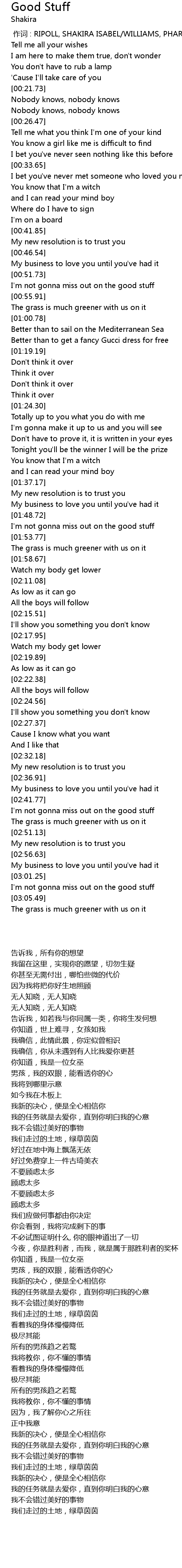 | [00:00.00] | 作词 : RIPOLL, SHAKIRA ISABEL/WILLIAMS, PHARRELL |