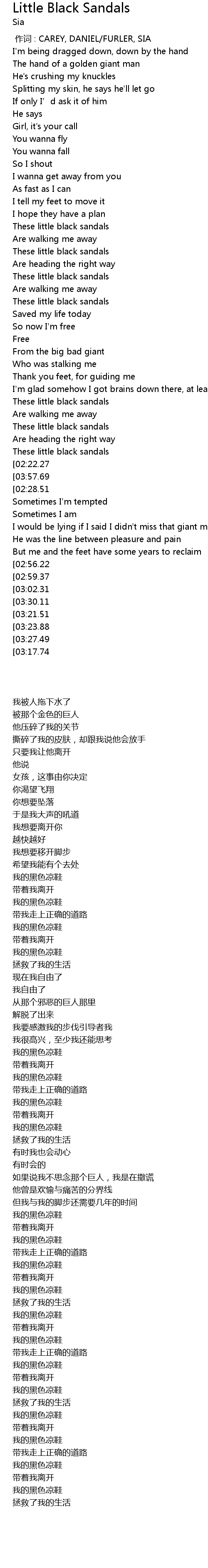 | [03:39.54][03:27.49][03:14.67] | These little black sandals |