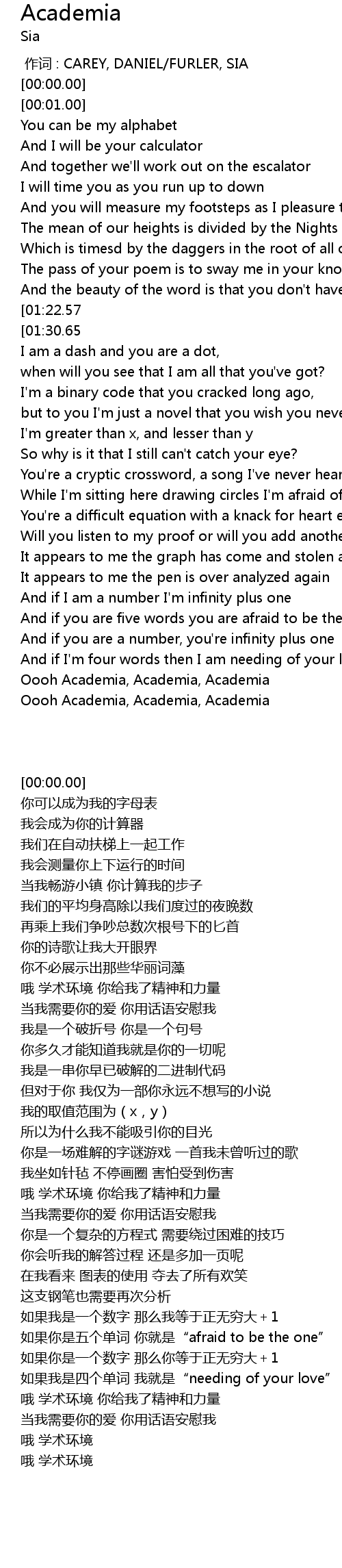 | [02:06.64][01:22.57][00:37.59] | Oh Academia, you can pick me up, |
