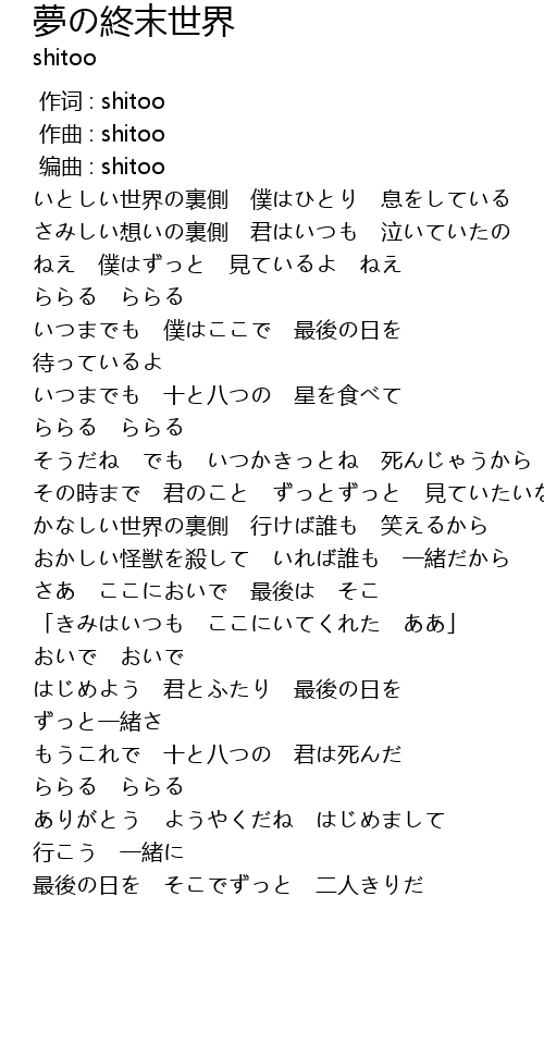 | [02:37.465] | 最後の日を そこでずっと 二人きりだ |