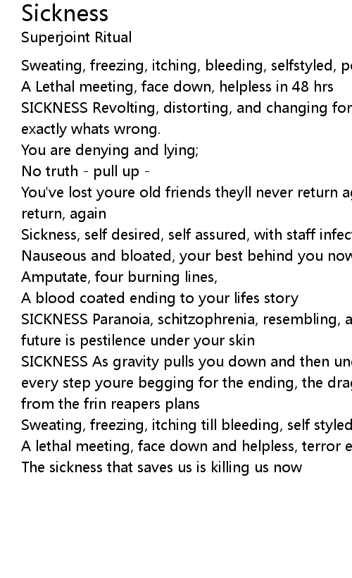 SICKNESS As gravity pulls you down and then under, the pain, it increases with every step youre begging for the ending, the dragon is sending you - messages from the frin reapers plans |