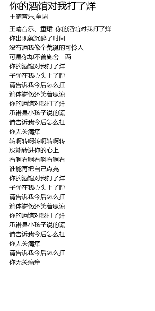 | [00:00.00] | 王晴音乐、童珺-你的酒馆对我打了烊 |