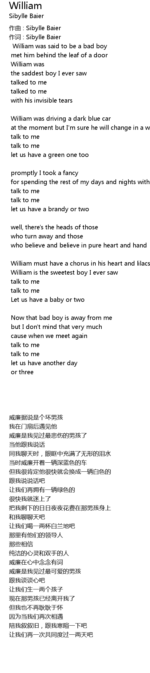 | William must have a chorus in his heart and lilacs in his shoes | |