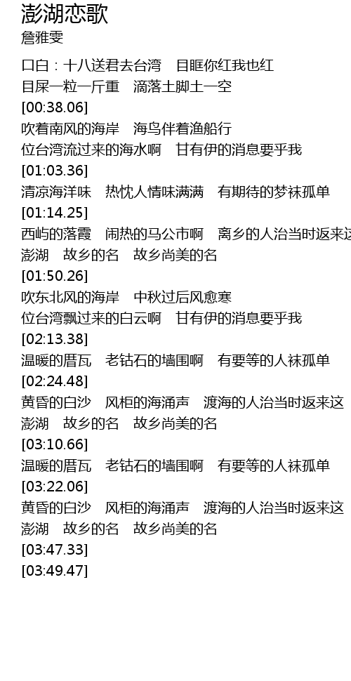 | [03:34.63] | 澎湖 故乡的名 故乡尚美的名 |