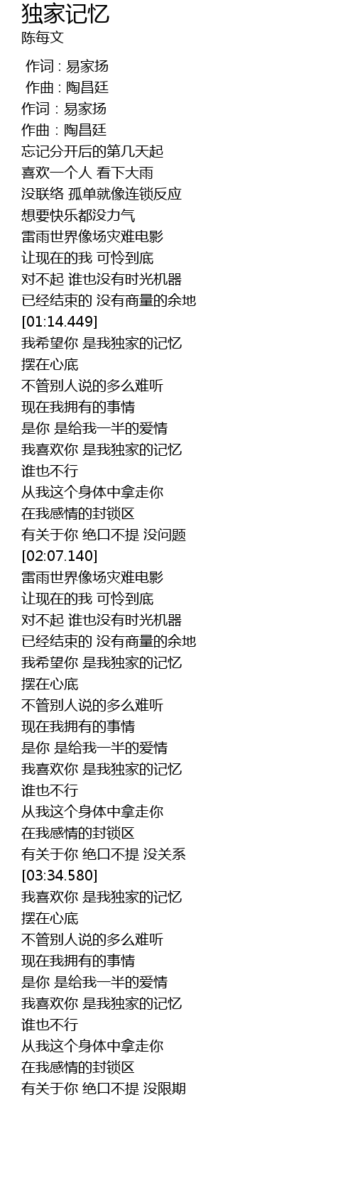 | [03:36.082] | 我喜欢你 是我独家的记忆 |