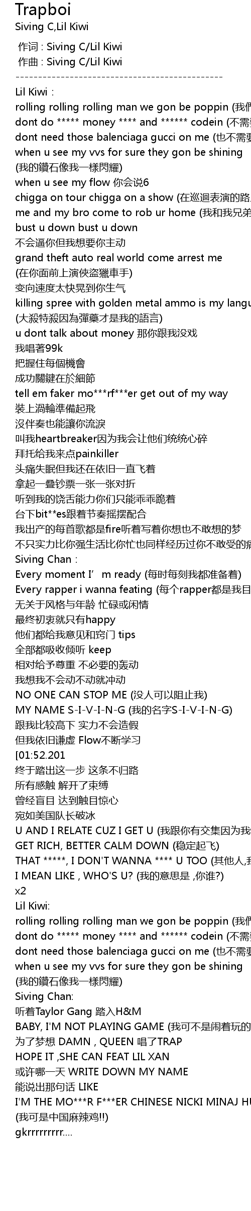 | [02:22.451] | dont do ***** money **** and ****** codein (不需要靠其他東西) |