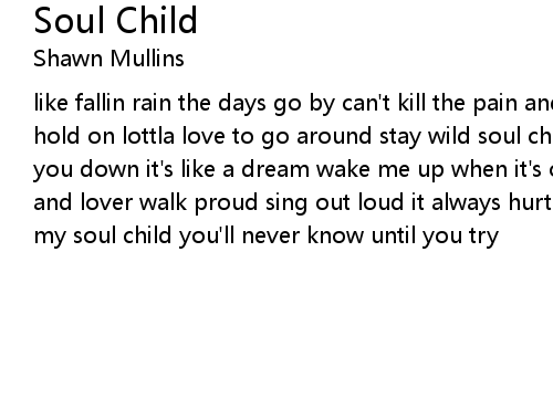 | like fallin rain the days go by can't kill the pain and you wonder why be strong hold on lottla love to go around stay wild soul child don't you let 'em bring you down it's like a dream wake me up when it's over somewhere in between enemy and lover walk proud sing out loud it always hurts to wonder why one more mile my soul child you'll never know until you try |