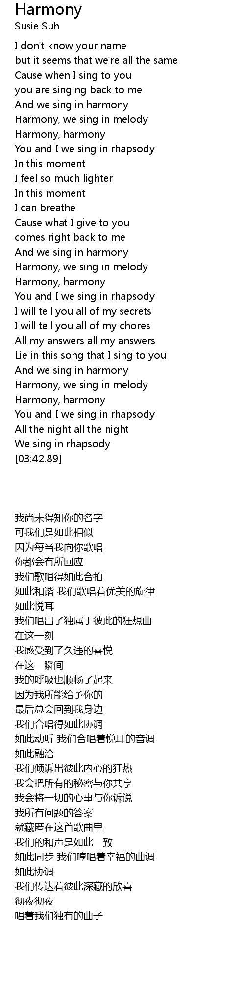 | [00:53.75] | Harmony, we sing in melody |